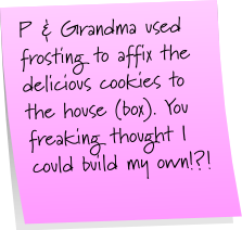 Post-It Note Tuesday P had a frosting moustache She was not in the mood for holiday crafts P & Grandma "gluing" cookies onto the box P had a blast blog-CrunchyVTMommy-archivesVeronica ArmstrongDecember 6, 2010Comment Facebook0 Twitter LinkedIn0 Reddit Tumblr 0 Likes